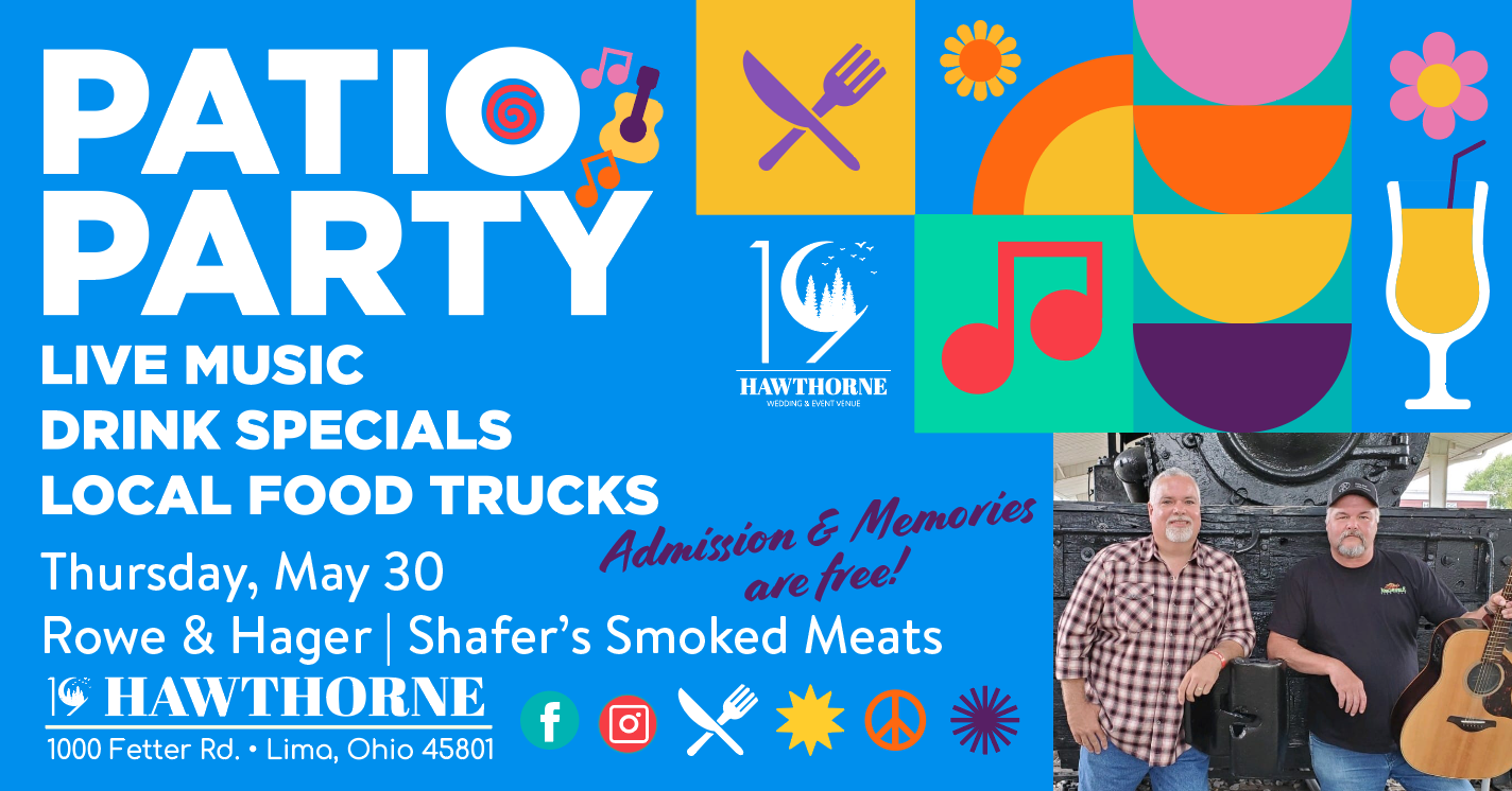 Patio Party 1 - Rowe & Hager Thursday, May 30, 2024 6:00 PM 9:00 PM 1000 Fetter Rd. Lima, OH, United States (map) Google Calendar ICS